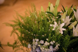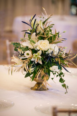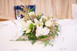 All tables were dressed with stunning arrangements from Jackie, The Flower Shop (South Elmsall) and she created a wild bouquet, with navy blue ribbon to match the accents in the room.