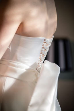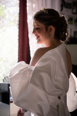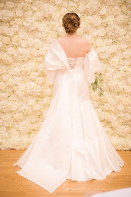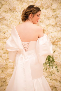 From Danielle of Danielle Sykes Designs on her bespoke dress: I wanted to create a gown that was dramatic, modern and timeless, so I used a plain ivory satin and focused on creating a striking silhouette. The puff ball sleeves
