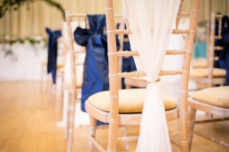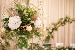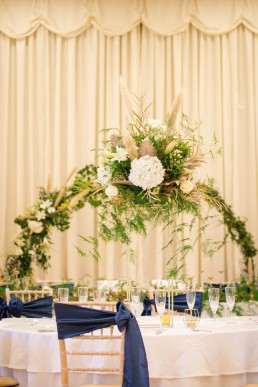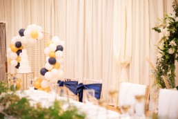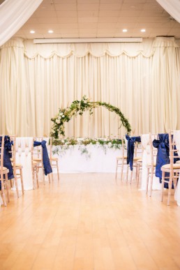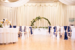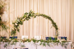 From Tammy, owner of Howards Events: We chose to go for a Navy, gold and ivory theme along with lots of greenery to tie in with the Pantone colour of the year. We gave the whole room a feeling of warmth and regalness using a mixture of textures. Jackie from The Flower Shop created a greenery hoop along with some gorgeous floral centrepieces. We added lots of finer details including lace charger plates and a stunning 3d luxury flower wall.