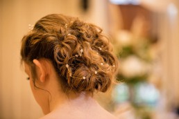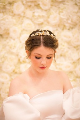From Nicola Whitfield (MUA) on her desired look: For the make up look I wanted to create a neutral palette so gold tones were used on the eyes and a pink toned lipstick complemented the look. To show off the beautiful hair accessories I designed a loose curled updo on our gorgeous model. It shows how several pieces can be worn together to create a cohesive look for your special day.