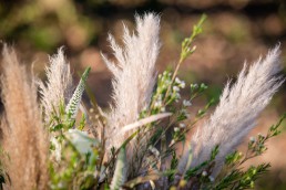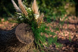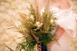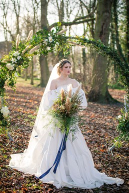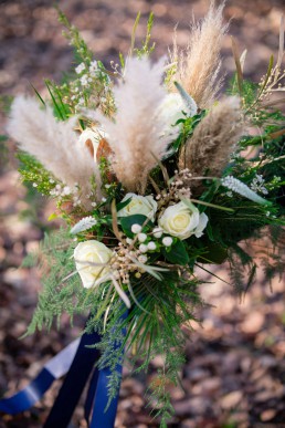 I wanted to do something that was on trend and at the moment pampas grass is so on trend so incorporated with the pampas I chose to put some stunning ivory avalanche roses, Veronica, mimosa which I sprayed gold to add richness, wax flower, dried palm lease sprayed gold for that touch of regalness and corn with trailing asparagus adding softness and a touch of colour and finished with a deep rich blue satin ribbon tied around the bouquet.