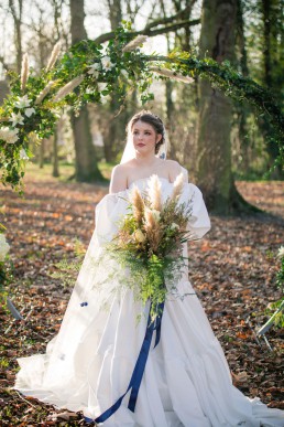 We chose Kirkham Priory as it has a beautiful bridge and the River Derwent running alongside. Zoe at Treasured Brides was so kind to work with us. At the dress fitting with our model, Alina, Ellie was immediately drawn to the long sleeved Daniela Di Marino dress from the Incanta collection. It perfectly fit the organic, whimsical theme we had planned and so much beautiful detailing throughout the bodice, sleeves and skirt.