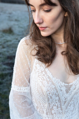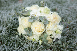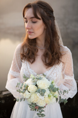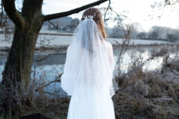 Paired with Alina’s striking, ethereal features, we all agreed it was ‘The One’. Flowers by Caroline was very kind to make us a beautiful white bouquet, using Carnations, Roses and silver, green Eucalyptus that perfectly mirrored the thick frost on the grass.