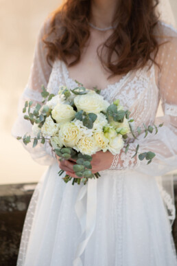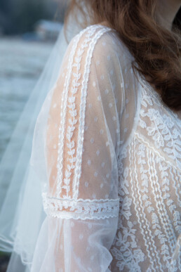 We chose Kirkham Priory as it has a beautiful bridge and the River Derwent running alongside. Zoe at Treasured Brides was so kind to work with us. At the dress fitting with our model, Alina, Ellie was immediately drawn to the long sleeved Daniela Di Marino dress from the Incanta collection. It perfectly fit the organic, whimsical theme we had planned and so much beautiful detailing throughout the bodice, sleeves and skirt.