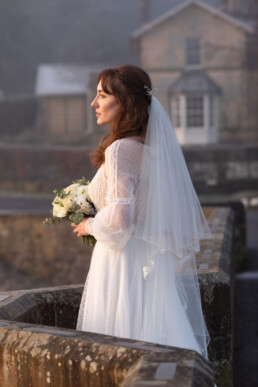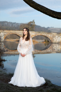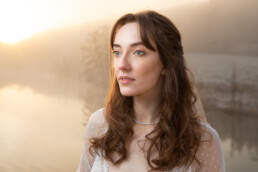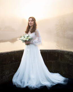 On the morning of the shoot, we got so lucky with the weather. We had an early start, and began shooting between 8.30am and 9.30am. It was still morning, with very little cloud cover, meaning nothing inhibited the bright morning glow that was diffused by the fog. This helped to create some incredible, romantic shots. We made the most of the scenic location, getting photos from the bridge (with gawking, confused commuters in passing cars), as well as from the lake side.
